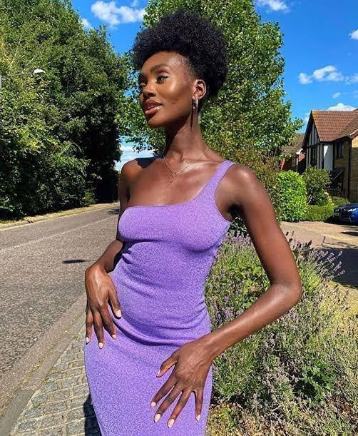 This form-fitting bodycon midi features an asymmetrical neckline, one-shoulder strap, vibrant purple colour featuring subtle sparkles throughout.