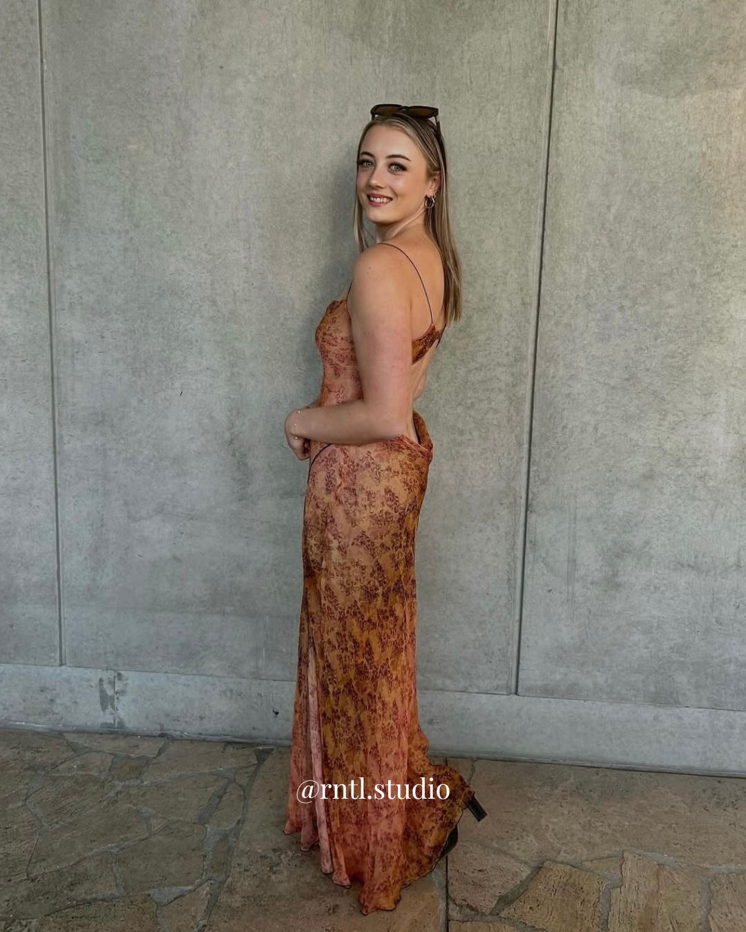 The Bec and Bridge Fleur De Lis Maxi Dress is cut on the bias from a sheer, lustrous printed fabric. The dress features a cowl neckline, mid thigh leg split and a contrasting clasp panel for a statement open cowl back.