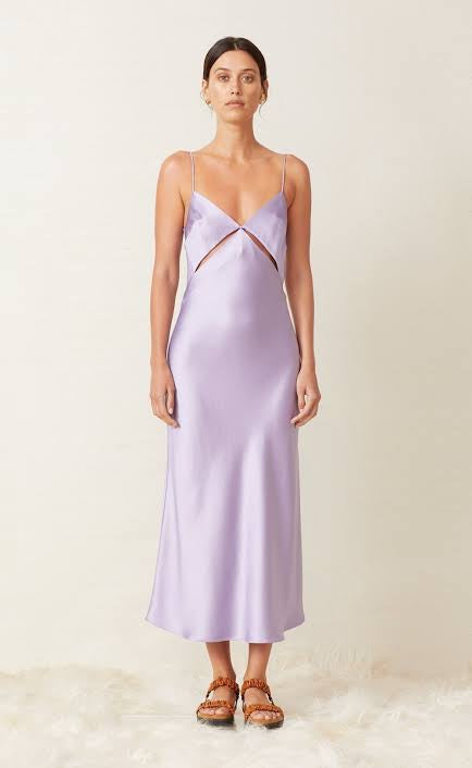Bias cut sleeveless midi dress with cut out v neck thin rouleau straps in self under bust cut out detail button up back with keyhole detail lower back cut out.