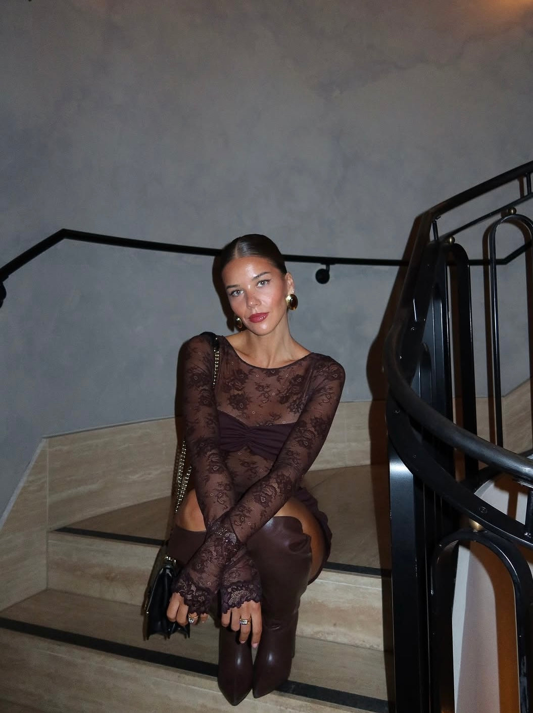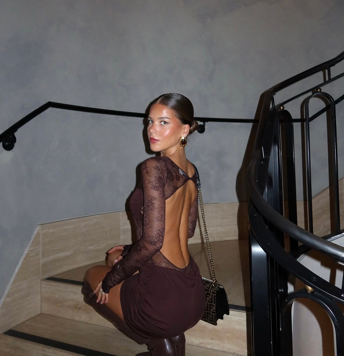 The Oskar Dress by BENNI is a mini-length silhouette, thoughtfully crafted from delicate lace and buttery-soft jersey. Designed with a boat neckline and long lace sleeves, this versatile dress suits any occasion. The sheer lace bodice features an overlapped bralette for coverage, while the draped cowl mini skirt adds a quintessential BENNI touch.