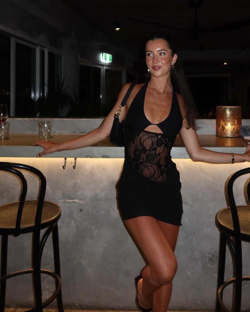 The Rocky Mini Dress is a must-have feminine silhouette, crafted from sheer lace through the built-in bodysuit and chiffon on the overlapping draped skirt. It features a wide halter neck ties, gathering on the waist and self tie at back neck.