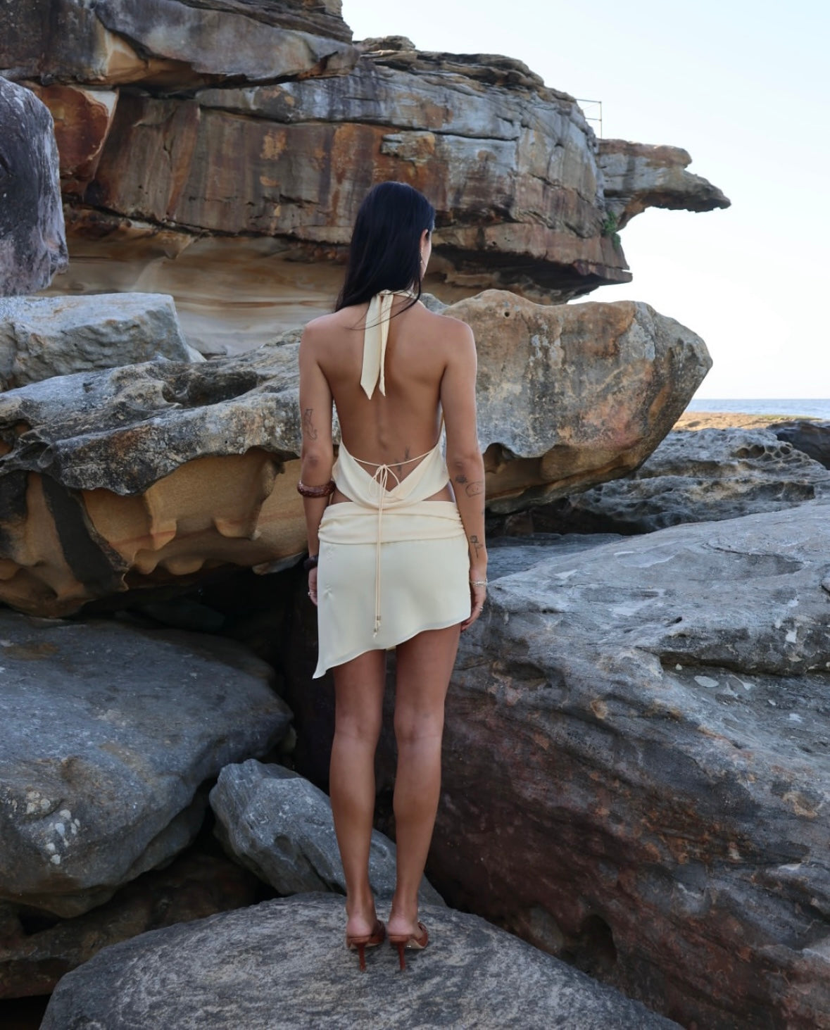 The Kaia Cowl top, crafted from draped fabric celebrates and accentuates the female figure, flattering your waist and décolletage with the draped neckline. The beautiful bias cut drape of the fabric, and open back detailing enhances the sensuality and allure of this top. The adjustable neck tie offers versatility, allowing the wearer to customise their level of coverage with ease.