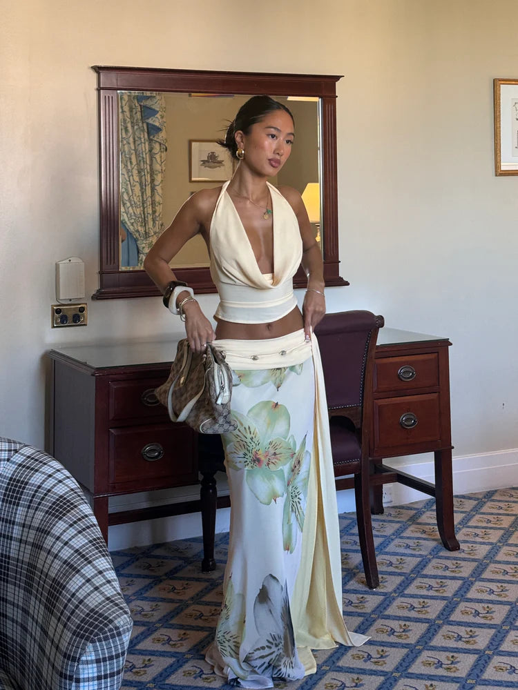 Introducing Belle, the perfect harmony of elegance and beauty. This skirt showcases a ruched waistband adorned with a delicate bead string, adding a touch of exquisite detailing. A flowing tie cascades gracefully, offering versatile styling options—whether wrapped elegantly around the waist or left to drape effortlessly.
