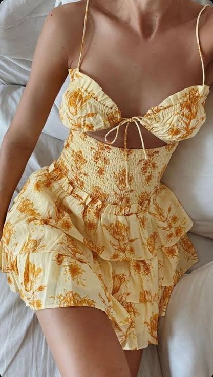 Fitted in all the right places, the Cara Dress is made from a luxurious yellow zipper crepe fabric with our exclusive sunset tulip print throughout. It features a gathered bust with centre tie and ruffle across neckline, cutout and shirring at waist and a flouncy triple tiered skirt.