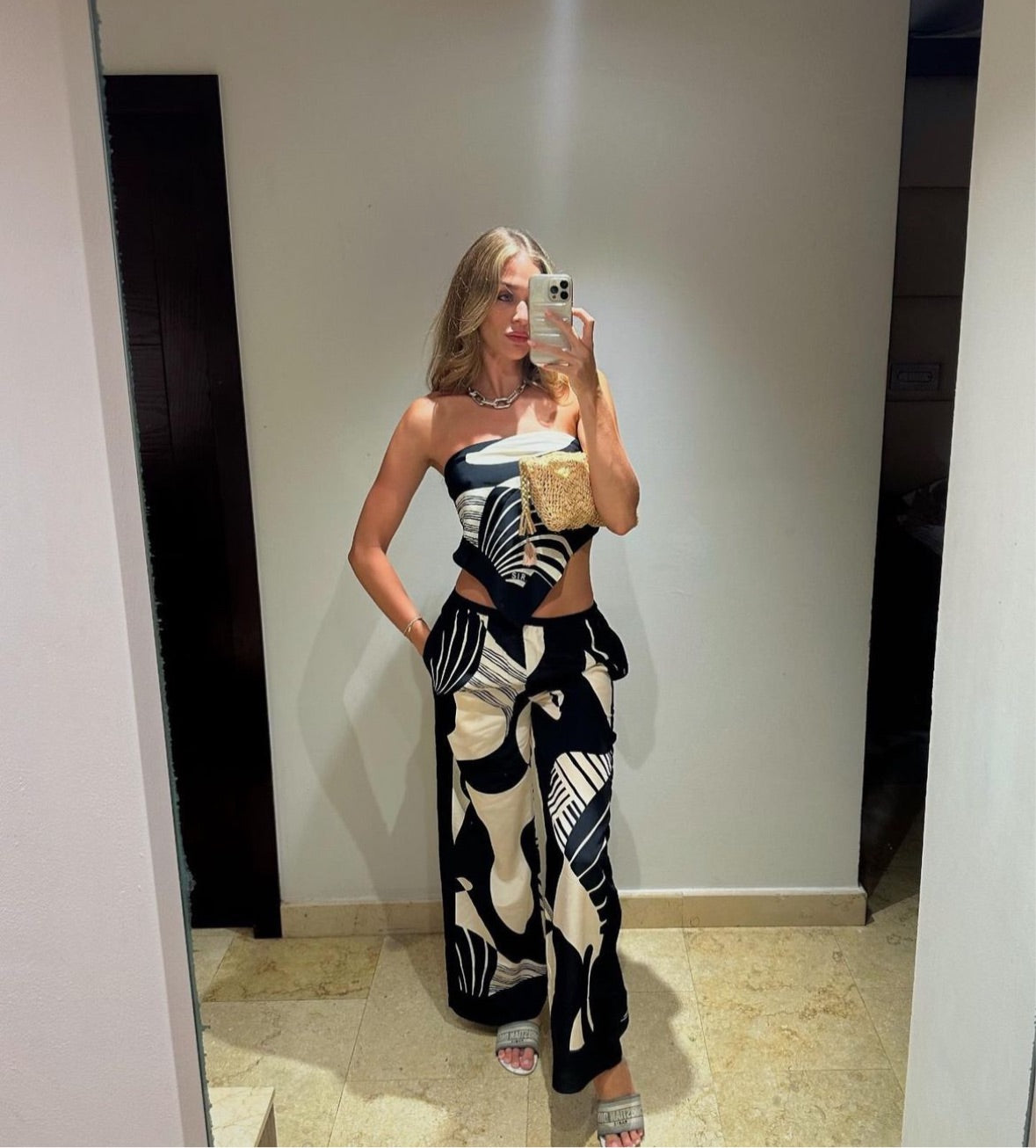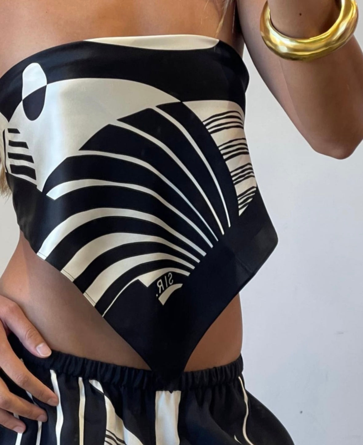 The Realisme Pant is a relaxed silhouette crafted from a naturally sourced silk crepe, in the Papier print. Cut to fit mid-high rise, featuring an elasticated waistband and contrast panels at the side legs and hem. Crafted from a naturally sourced silk crepe fabric in the Papier print, an abstract monochrome print exclusive to SIR, the Realisme scarf is a styling piece which can lift any outfit, or be worn as a top.