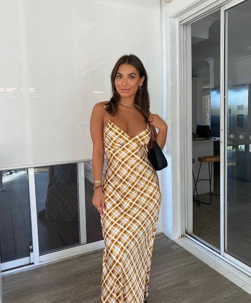 The Bec and Bridge Amber V Maxi in Sunflower Check is cut on the bias from a luxe silk, featuring under bust seams with light gathering, non-adjustable straps and a low cut back.
