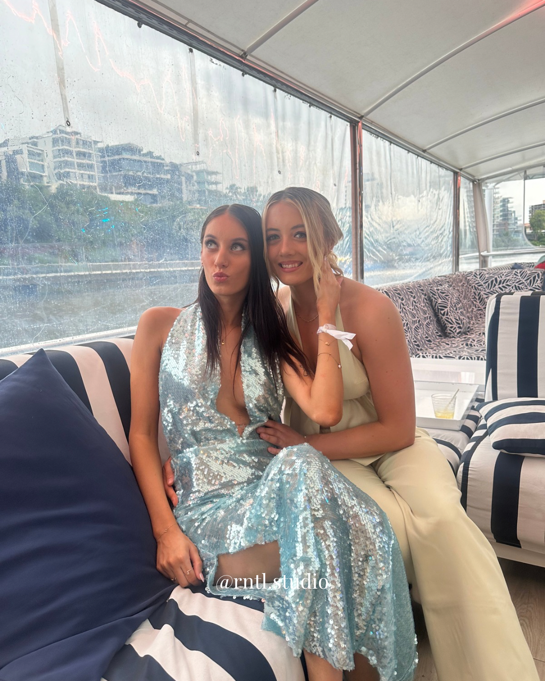 The custom designed YLD Straight Maxi in ’Ice Blue’ features a full length skirt with side leg slit and centre back zip and a single pleat halter detail.